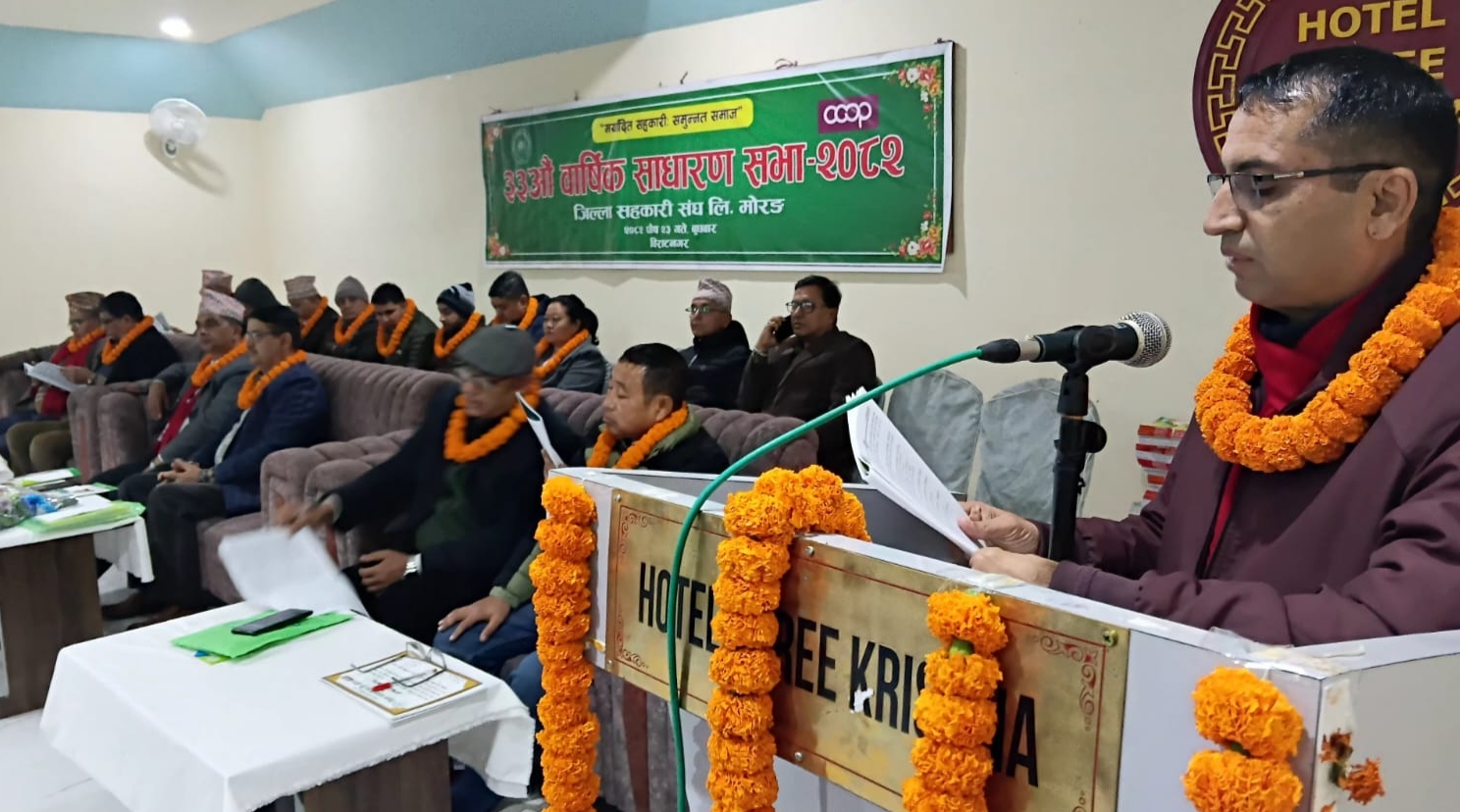 विराटनगर । जिल्ला सहकारी संघ लिमिटेड मोरङको ३३औँ वार्षिक साधारणसभा विराटनगरस्थित श्रीकृष्ण होटलमा भव्य रूपमा सम्पन्न भएको छ । साधारणसभाबाट राकेश दाहालको अध्यक्षतामा नयाँ नेतृत्व चयन भएसँगै संघको नेतृत्व संरचना औपचारिक रूपमा फेरिएको छ ।